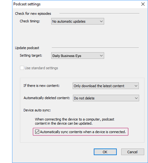 Установите флажок [Автоматически синхронизовать содержимое при подключении устройства.]. Затем нажмите [ОК].