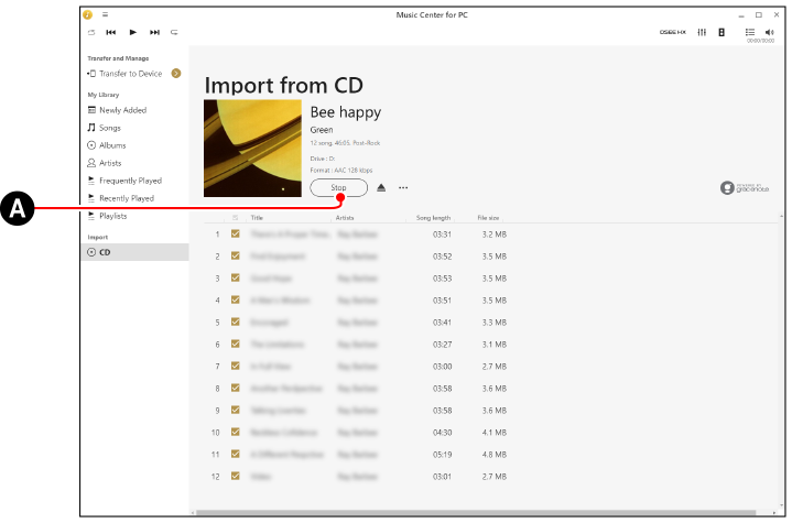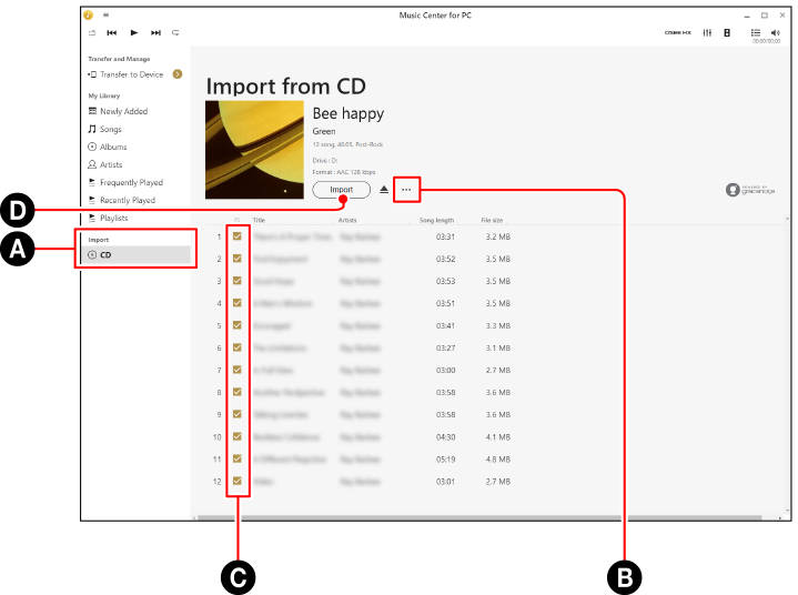 В приложение “Music Center for PC” можно импортировать композиции с аудио CD. Импортированные композиции будут сохранены на внутреннем носителе (HDD/SSD).