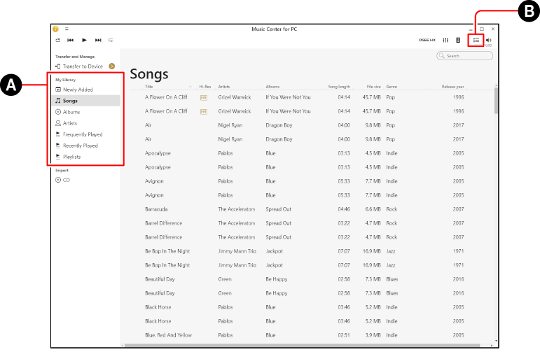 Кроме того, композиции можно добавлять в очередь путем нажатия [] для интересующей композиции в списке содержимого и выбора [Воспроизводить дальше] или [Добавить в очередь воспроизвед.].
