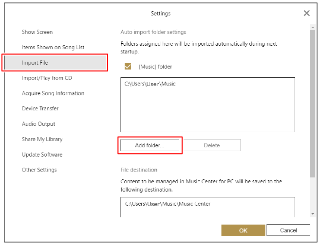 Для импорта библиотеки запустите приложение “Music Center for PC” после завершения установки, а затем выберите [Настройки] в меню [Инструменты], нажав (меню) в верхнем левом углу. Установите флажок [Папка [Музыка]]