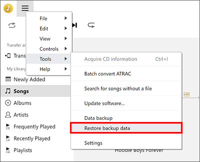 - Восстановление данных из резервной копии, созданной с помощью приложения "Music Center for PC Ver.2.2.0" или более поздняя